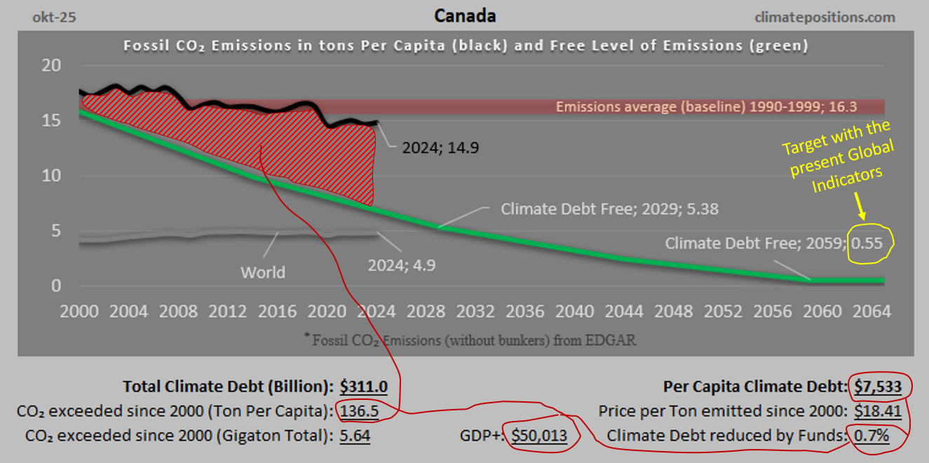 The screenshot above shows some key figures of Canada from the Calculation (Excel). The first line is not yet relevant to any country (might never be relevant). The green bubbles show: 1) The Canadian accumulated price on its Climate Damage Per Capita, 2) the accumulated deposited Multilateral Climate Funds (Canadas Climate Change Finansing Per Capita), and 3) the Climate Funds deducted from the Climate Damage Pricing to reach the accumulated Climate Debt Per Capita.