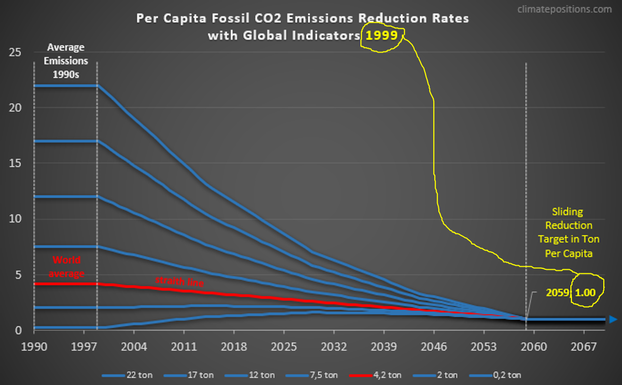 The diagram above illustrates the general concept: All countries must reduce Fossil CO2 Emissions Per Capita towards the same “Sliding Global Reduction Target” by 2059.