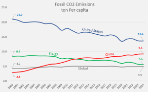China, United States, EU-27 and Global Fossil CO2 per capita